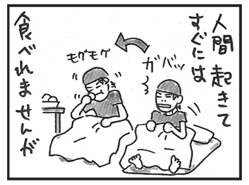 目が覚めて、2秒でごはん…。ムリムリムリ。